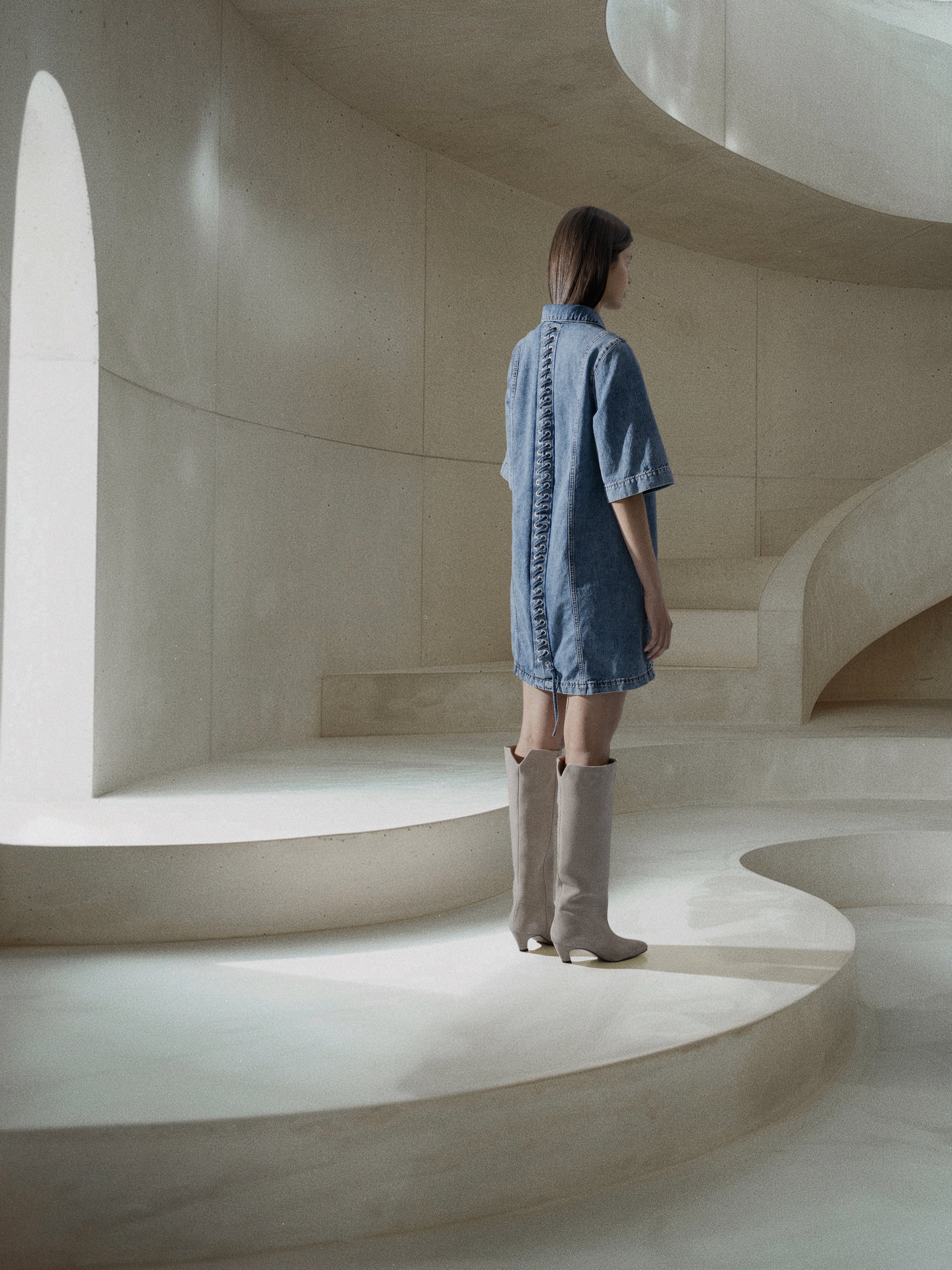 - Stryg ved lav temperatur. Vendes på vrangen ved strygning.