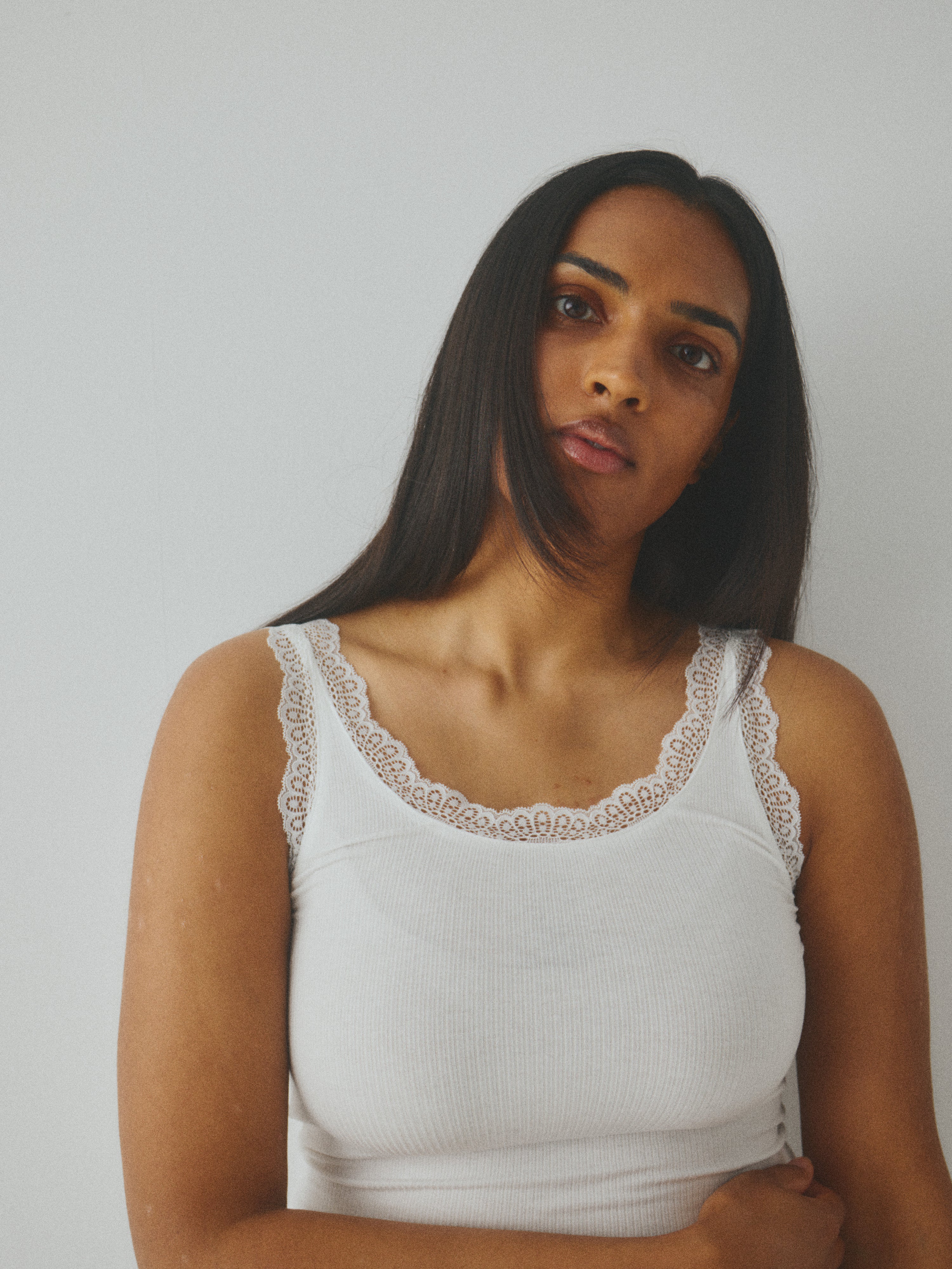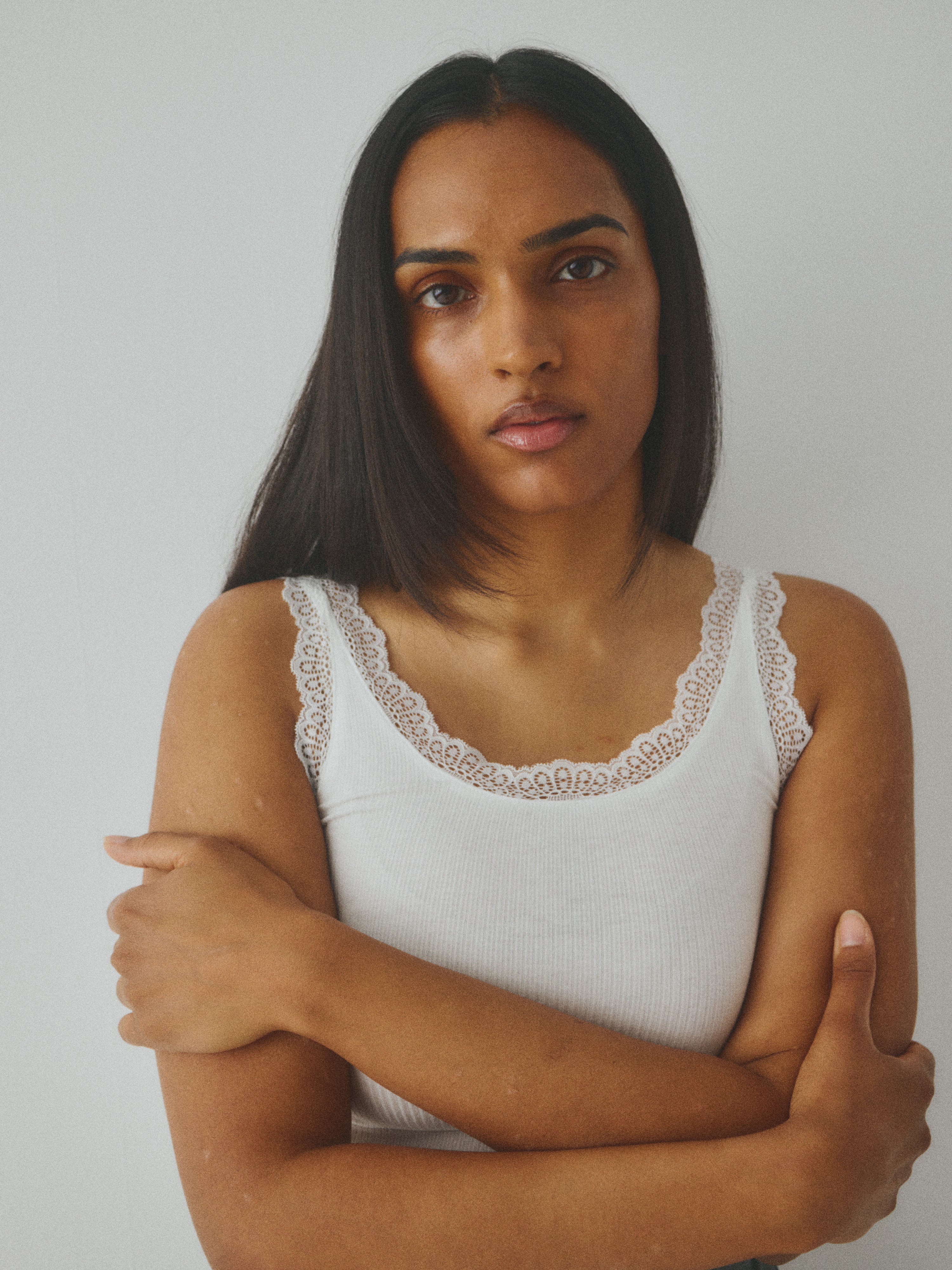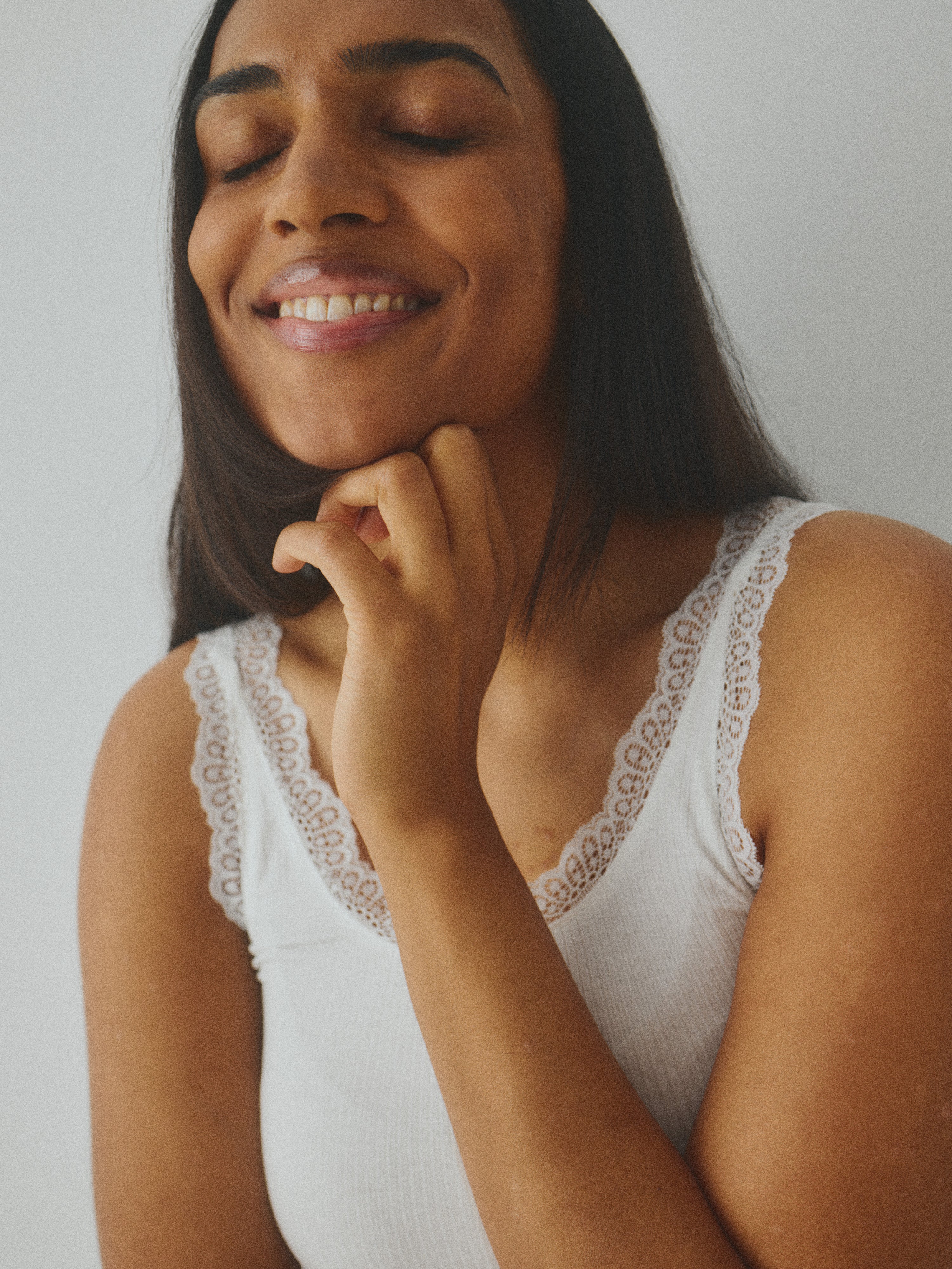 - Stryg ved lav temperatur. Vendes på vrangen ved strygning – stryg ikke blonder.