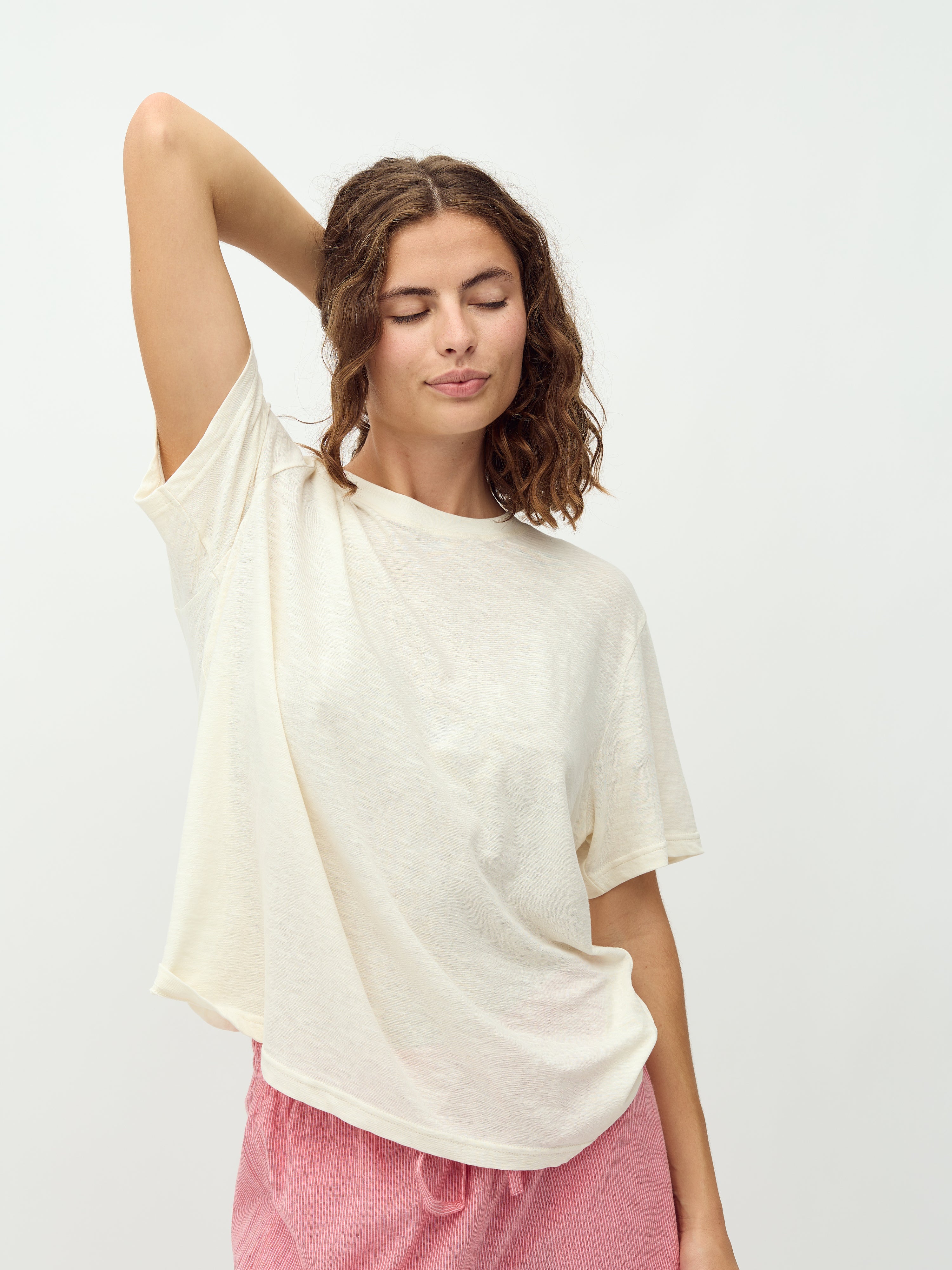 Løse bukser med elastik og bindebånd i taljen.