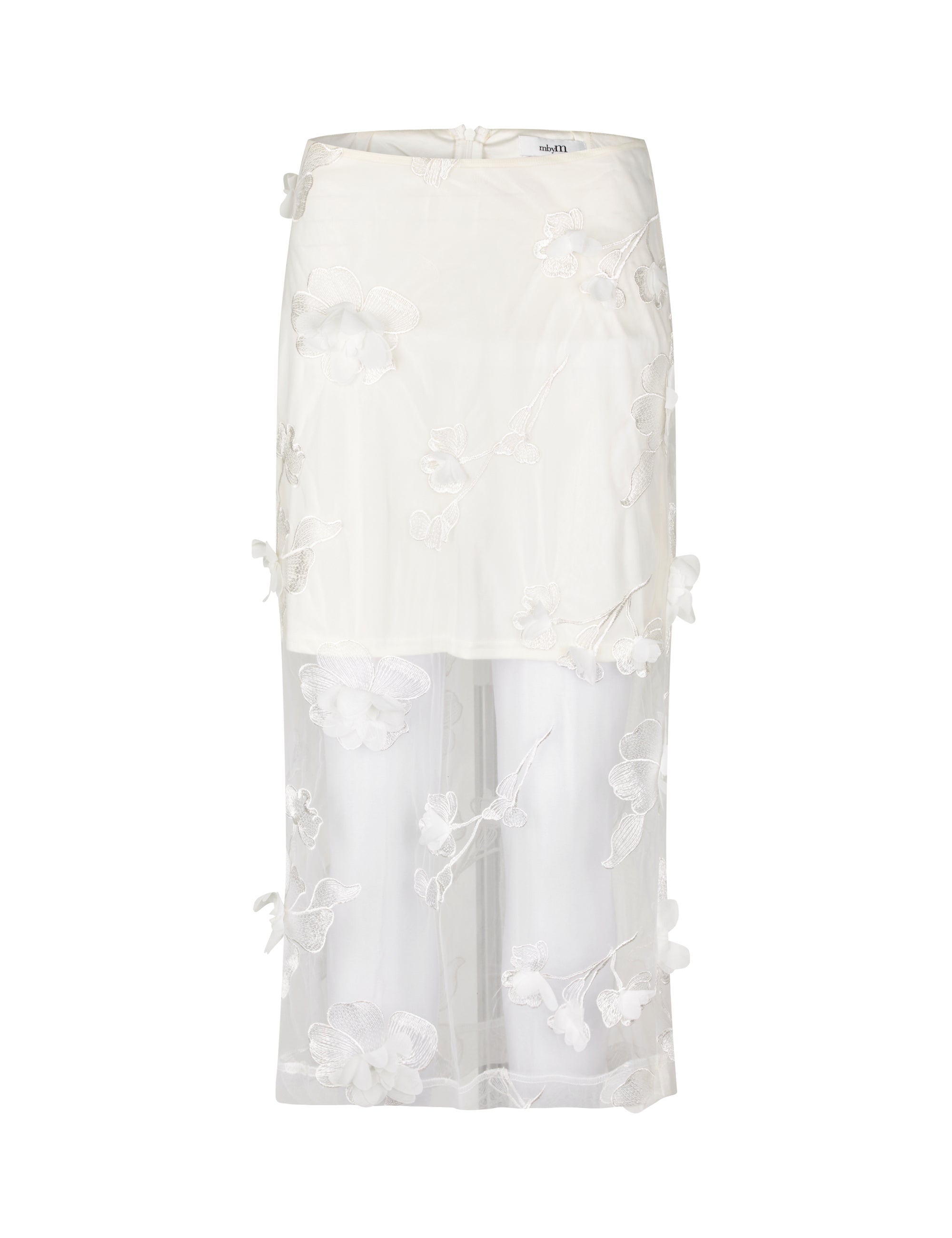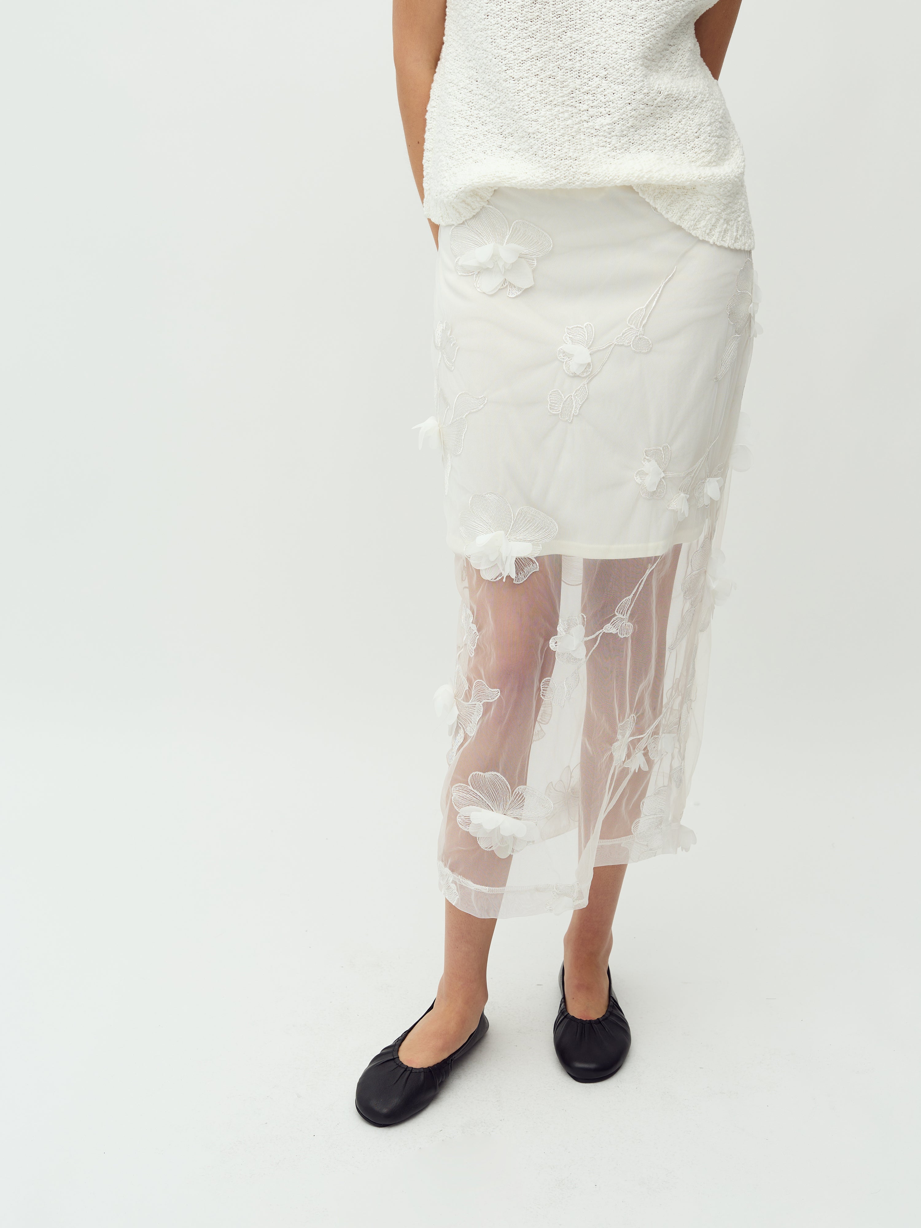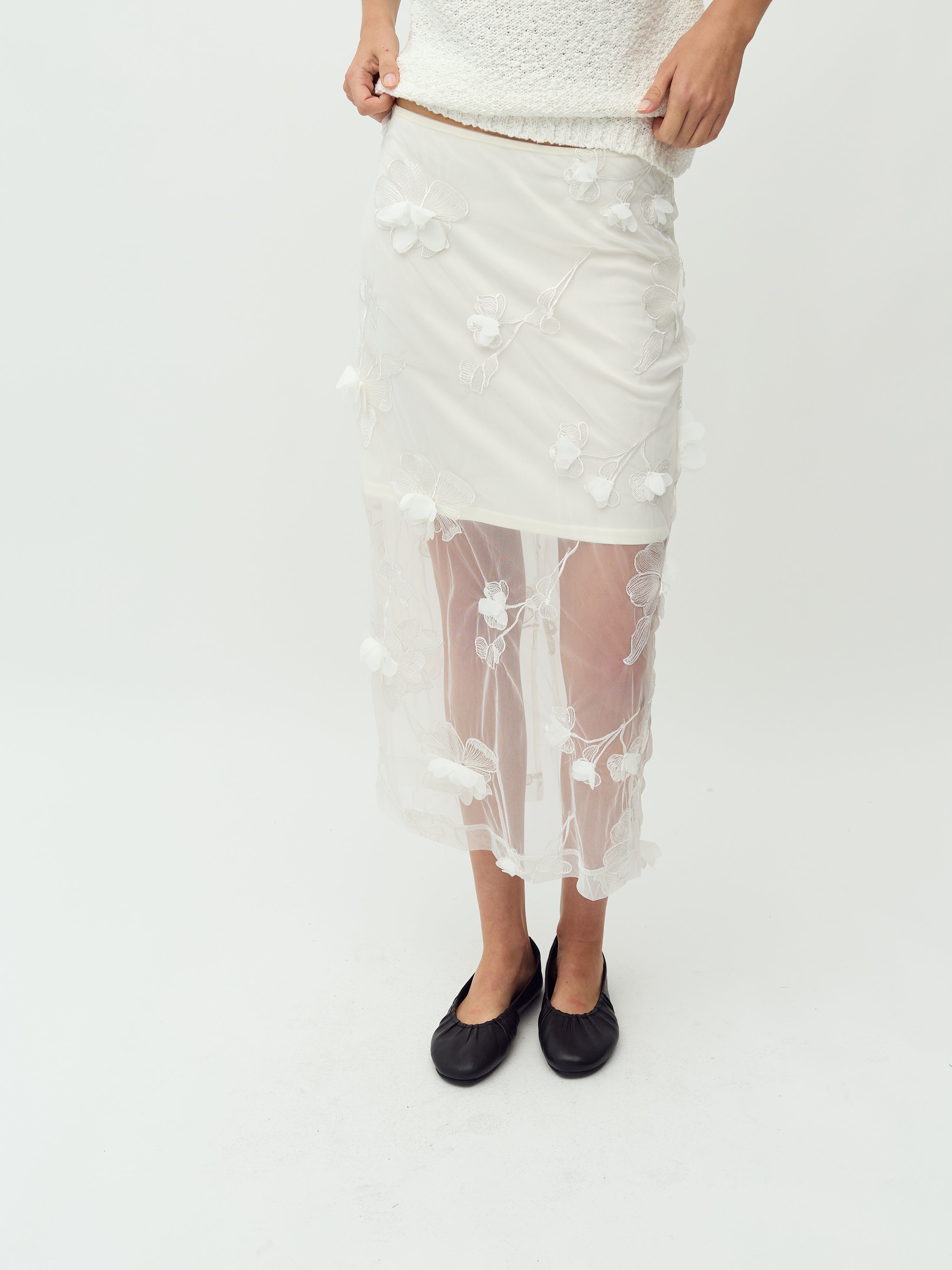 Gennemsigtig nederdel med 3D blomster.
