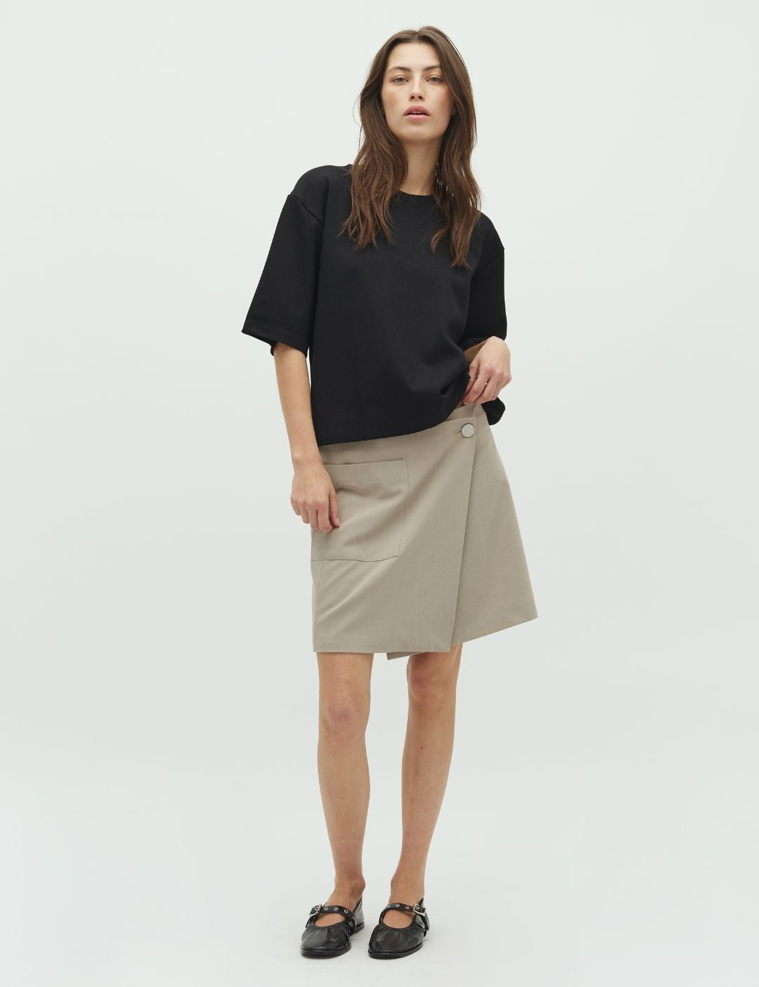 - Stryg ved lav temperatur. Vendes på vrangen ved strygning.