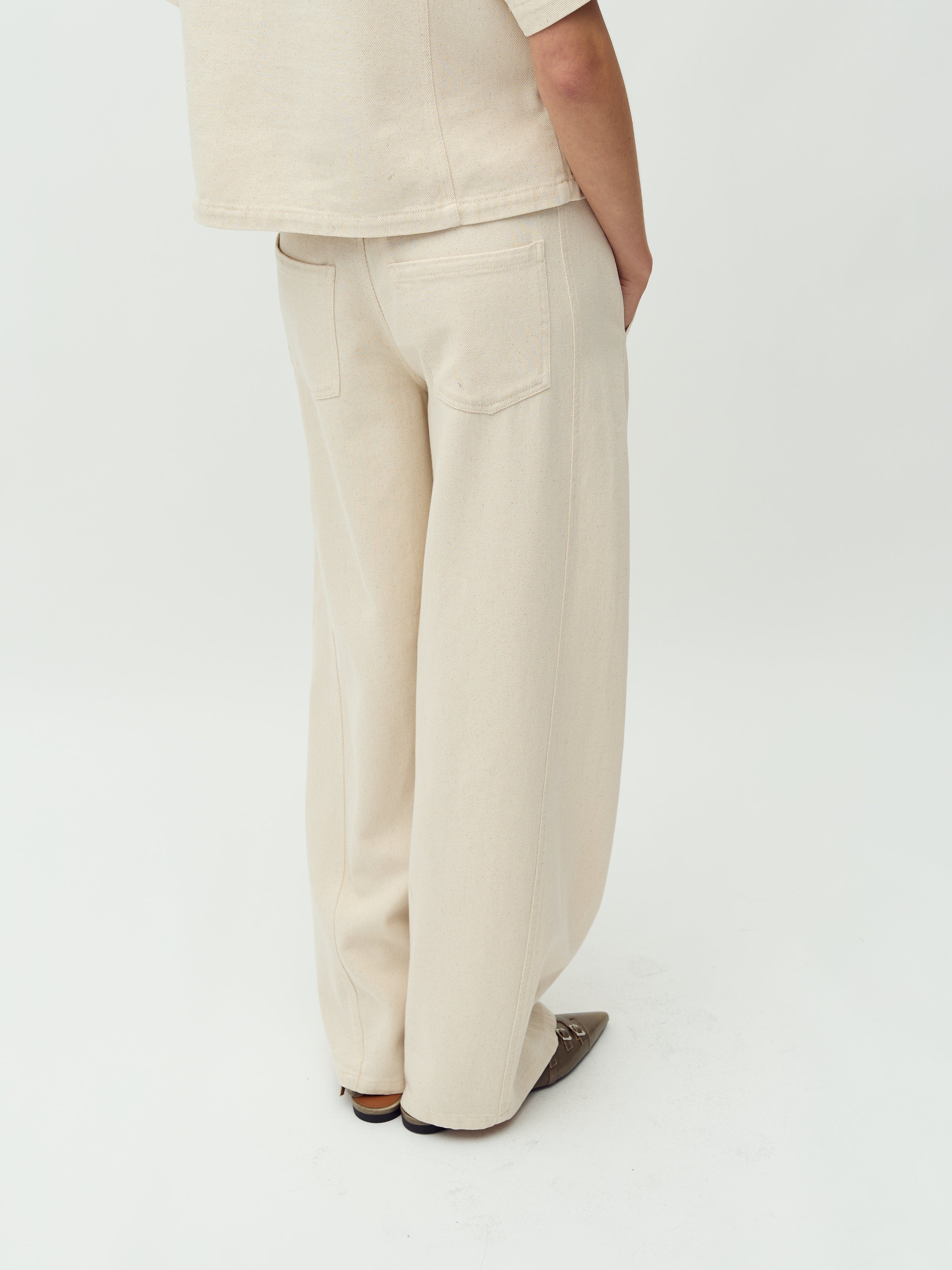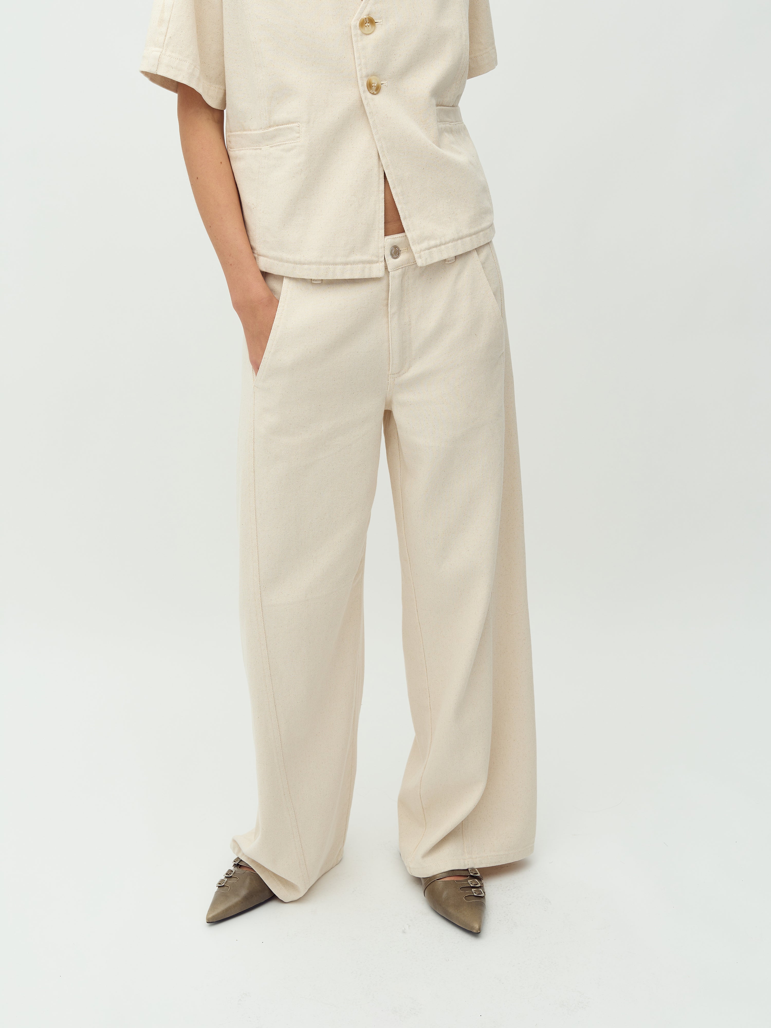 Bukser med brede ben og lommer i siden.
