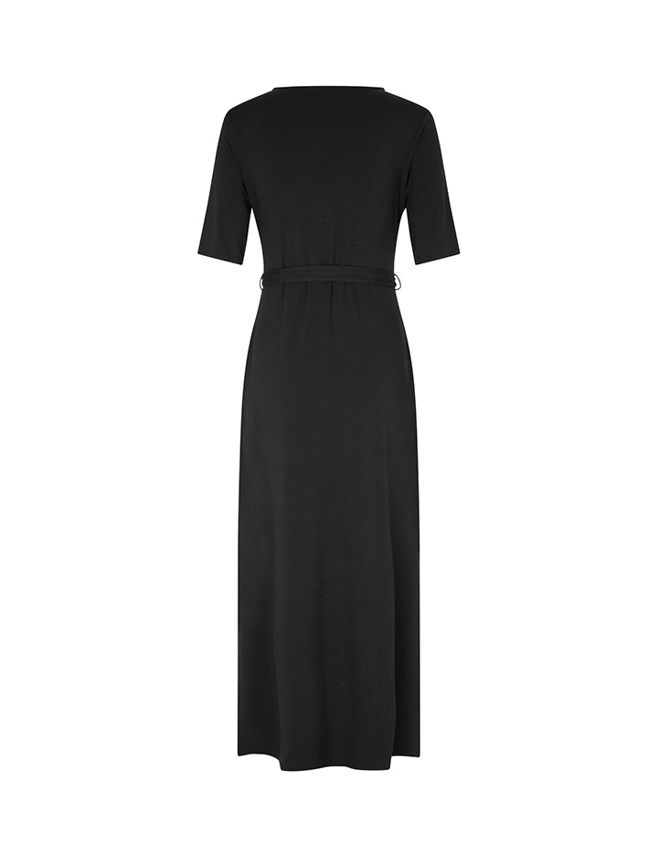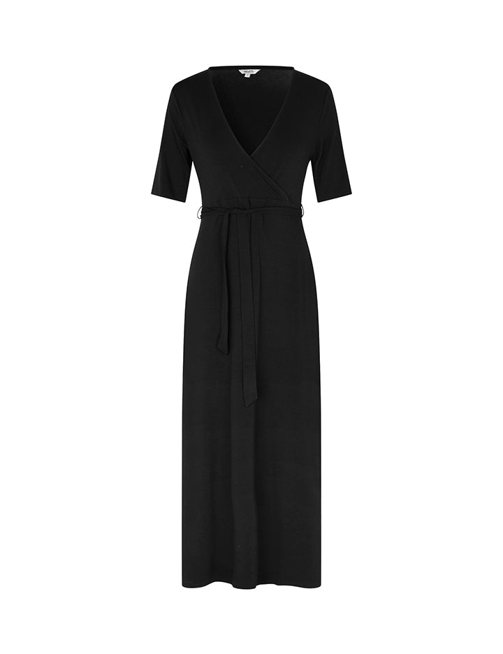 Maxi-kjole med korte ærmer, fake wrap og bælte.