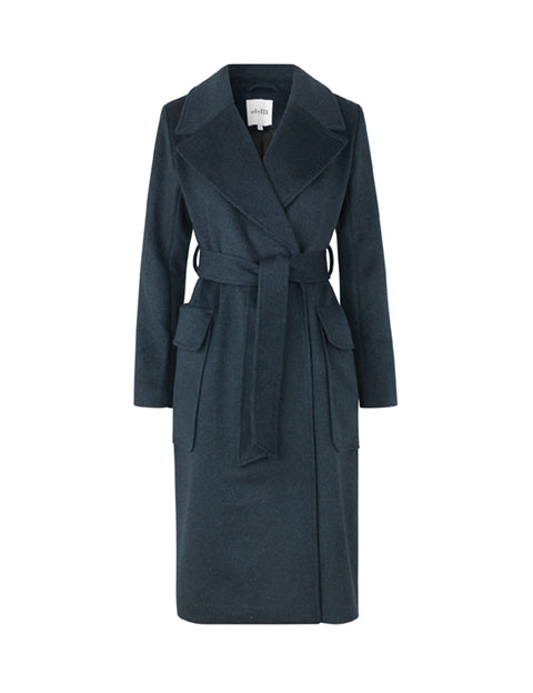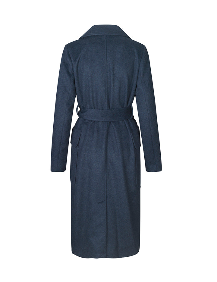 Vinterfrakke med reverskrave og bindebånd i taljen.
